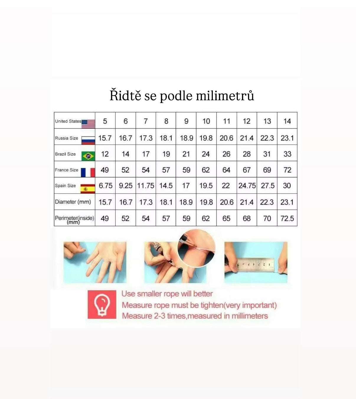 💡 Pro tip: Měřte prst v odpoledních hodinách, kdy jsou ruce nejvíce prokrvené. Nezapomeňte, že prsten musí projít i přes kloub!